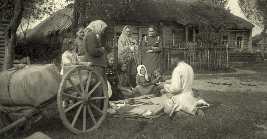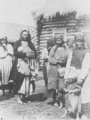 Крестьянские семьи на фоне своих домов, конец XIX — начало XX века.