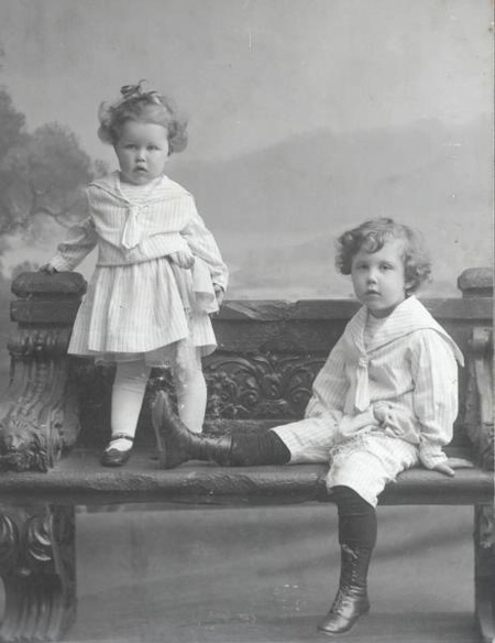 На первой фотографии изображены дети из обеспеченной семьи начала XX века, снятые в студии или просторном, богато обставленном интерьере. Позы детей постановочные, взгляд направлен в камеру, одежда аккуратная, парадная, а фон подчёркивает высокий социальный статус семьи. Этот портрет создавался не просто для фиксации внешности ребёнка, а как памятная запись для семейного альбома, отражающая статус, воспитание и эстетические ценности семьи. Фотография фиксирует ребёнка как важного члена рода, будущего наследника семейной традиции, и выполняет функцию символического закрепления его принадлежности к семье и социальному кругу.