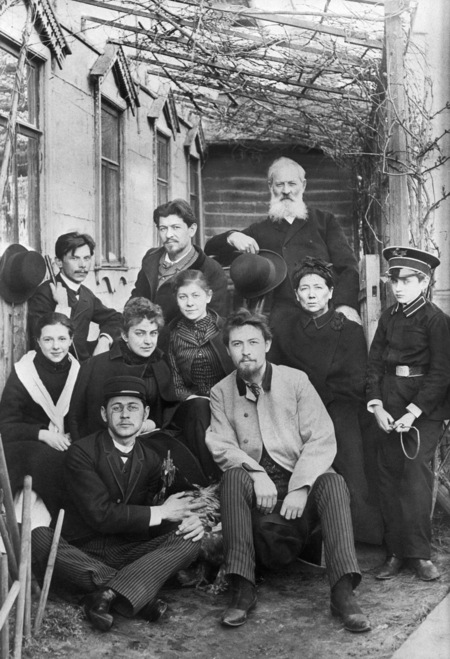 Семья Чеховых. Таганрог, 1874 г. Сидят с лева направо: брат писателя Михаил, сестра Мария, Отец Павел Егорович, мать Евгения Яковлевна, жена дяди Митрофана Егоровича Людмила Павловна, их сын Георгий.