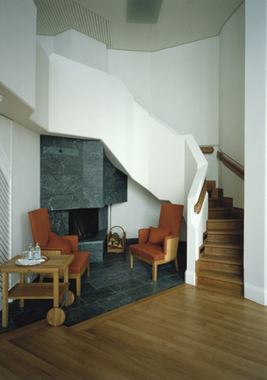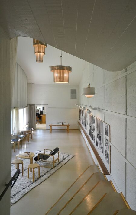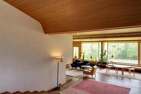 В проекте Mairea ярко проявляется талант Аалто в использовании единства естественных материалов, в том числе и в интерьере: потолок большой гостиной подшит сосновыми рейками, колонна из стальной трубы отделана берестой. Гостиная (как и у Райта) разделена на отдельные, независимые друг от друга части различного назначения.