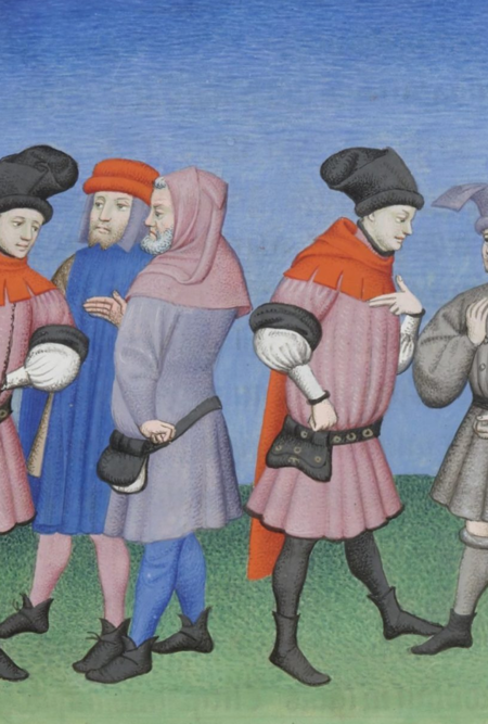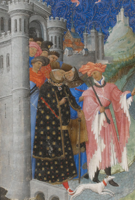 Братья Лимбург, Дополнительная миниатюра к «Малым часам Жана Беррийского». Герцог Жан Беррийский отправляется в паломничество, 1412 // Сайт commons.wikimedia.org (URL: https://commons.wikimedia.org/wiki/File:D%C3%A9part_pour_un_p%C3%A8lerinage_-Petites_Heures_du_duc_de_Berry-_BNF_Lat18014_f288v.jpg) Просмотрено: 25.11.2025.