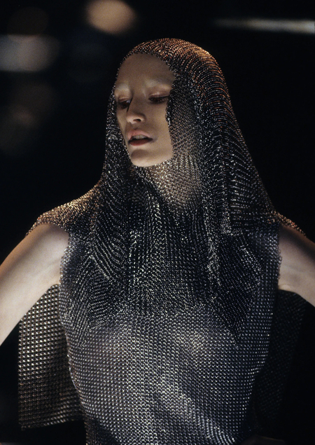 Еще один из популярных приемов конца XX века, особенно в платьях. В отличие от оригинального изделия, «кольчужные» платья обладают дуальностью, с одной стороны отсылая к чему-то сильному, крепкому, с другой — делая человека уязвимым, хрупким.