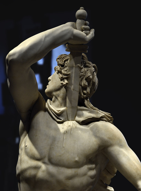 В скульптуре, изображающей героическое самоубийство, динамичная поза показывает решительность и отчаяние самоубийцы, эмоции, схожи с теми, что испытывает боец в борьбе или мифический герой в сражении. Но при этом мертвая жена изображенного героя, убитая им же, делает эту скульптуру намного более пугающей, чем просто картину борьбы.