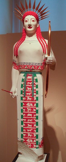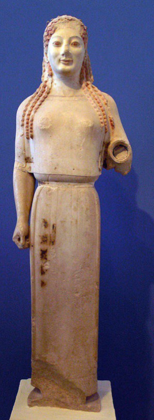 Рассмотрим, как выглядели архаичные женские статуи — коры (девушки). В отличие от куросов (мужчин), они были более разнообразными. Четырнадцать статуй, найденных на Афинском Акрополе во второй половине 19 века являются самым ярким примером. В статуях куросов скульпторы старались передать человеческую анатомию и пластику тела, а у женщин они хотели показать тело под одеждой, создав иллюзию ткани из камня. На корах одежда, которая называется хитон и пеплос (длинные полотняные сорочки) и гиматий (плащ).
