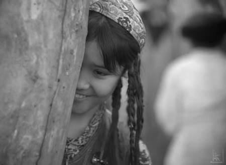 Левый кадр: Алтынай осторожно выглядывает из-за опоры — жест, который сочетает любопытство и недоверие. Крупный план фиксирует её робость и внутреннюю защиту.