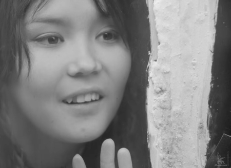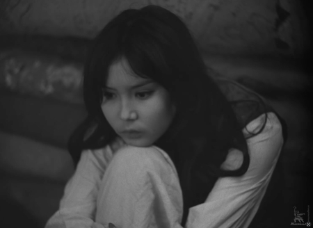 Левый кадр: взгляд Толгонай устремлён вверх, как будто она ищет ответа или поддержки. Свет выделяет её лицо, усиливая чувство внутреннего надлома.