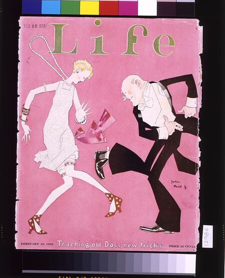Слева направо: 1. Иллюстрация на обложке журнала Life, 18 февраля 1926 г., на которой изображен хорошо одетый пожилой мужчина, танцующий с флэппершей / Джон Хельд-младший. 2. Иллюстрация на обложке журнала Life, 18 марта 1926 г., на которой изображена женщина в позе «Мыслителя» Родена, держащая в руках экземпляр книги «Любовные признания» / Джон Хельд-младший.