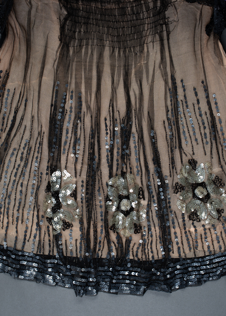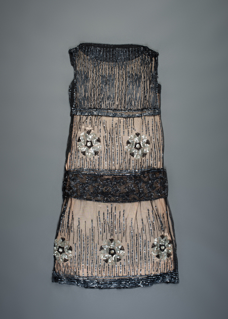 Черное платье из сетки с бисером, пайетками и телесной подкладкой, 1920–1929 гг.
