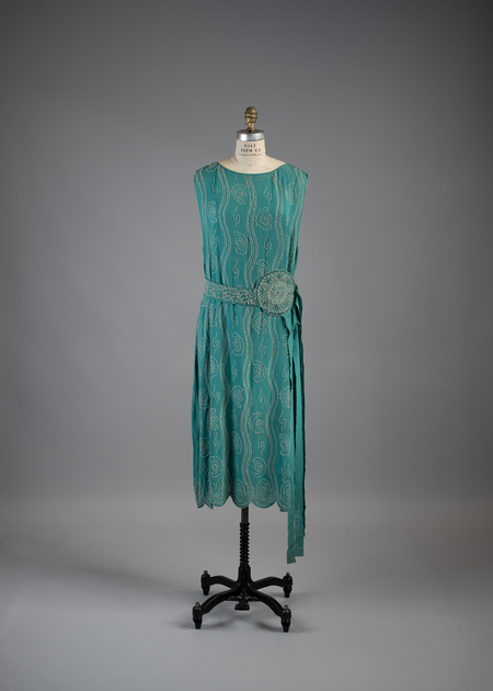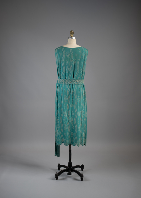 Платье-туника с бисерной отделкой цвета морской волны, волнистым подолом и бисерным поясом, 1920–1929 гг.