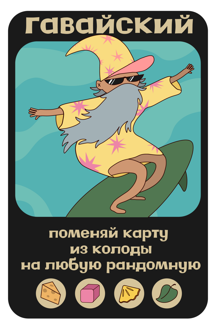 В игре есть такие ингредиенты: тесто — 12 карт; соус — 12 карт; сыр — 19 карт; начинки — 24 карты;
