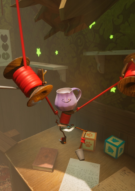 Особенность Кружечки — ниточные руки. Он может цепляться ими за мотки ниток и запускать себя в воздух.