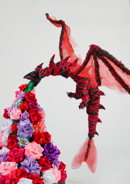 Дракон, как мифическое существо, часто ассоциируется с силой, страхом и разрушениями. Черный дракон, представленный в текстильной скульптуре, на первый взгляд вызывает те же ассоциации, однако он неожиданно оказывается не разрушителем, а созидателем, извергая вместо огня цветы, тем самым переворачивая стереотипы.