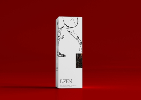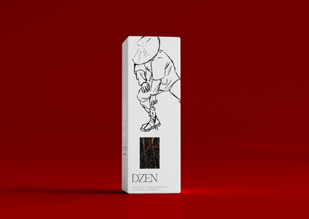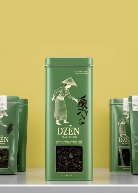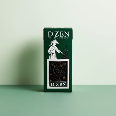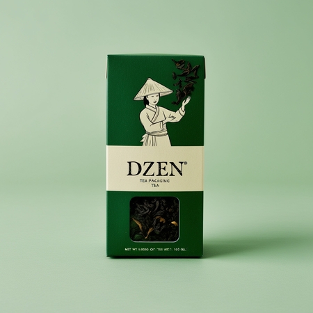 promt: The image shows a green rectangular package standing horizontally on a solid white background. The package shows a figure of woman in traditional clothes and a conical hat, made with black lines like drawing of pencil. At the bottom there is a small window in which dark tea-like leaves are visible. The figure is drawn as if it is throwing the collected leaves down to the packaging window. The word «DZEN» is printed under the window