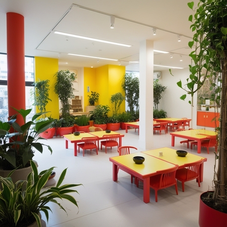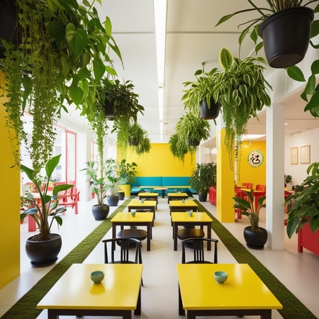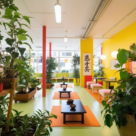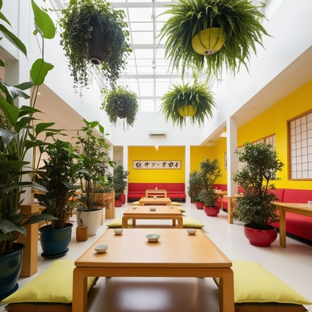 promt: There are many living plants around. The cafe is bright and has a lot of space. there are tables for tea ceremonies. the interior is decorated in bright colors. Tables are low, similar to tables in Japan