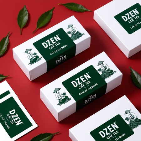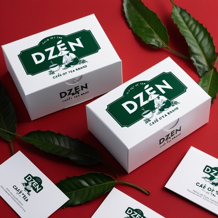 promt: The image features a branding set for «DZEN Café of Tea.» There are two white boxes with green labels that have the word «DZEN» prominently displayed, along with the text «Café of Tea Brand.» The labels feature illustrations of people in traditional attire with conical hats, one sitting and the other gathering tea leaves. Surrounding the boxes are green tea leaves, and there are also business cards on the red surface that share the same design theme as the boxes.