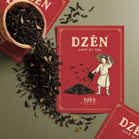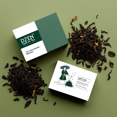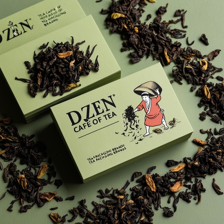 promt: The image features a set of business cards labeled «DZEN Café of Tea,» which is described as part of «Tea Packaging Brands.» Cards are green, and scattered around it are dried tea leaves. The business cards have a illustration that shows a person wearing traditional Asian clothing and a large hat and throwing the collected leaves down. The background is a muted green, complementing the earthy tones of the tea and cards.