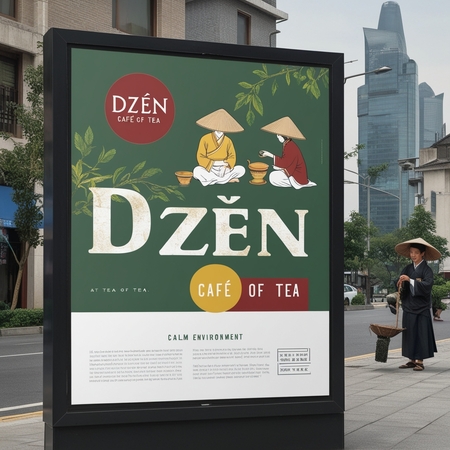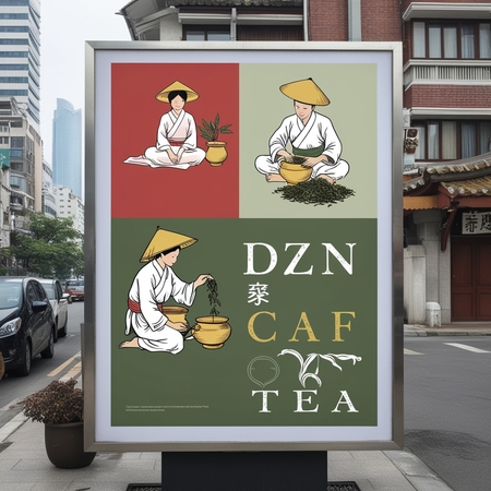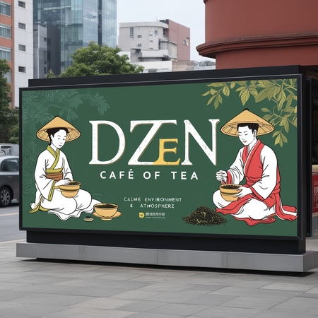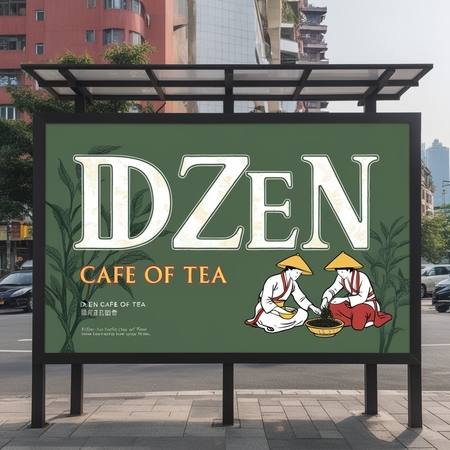 promt: generate a mockup of a poster for the «DZEN Cafe of Tea». On the billboard some feature illustrations of people in traditional attire with conical hats, one sitting and the other gathering tea leaves. Calm environment in the city around of the billboard. The logo «DZEN» should be made of antique letters, thin and have asian atmosphere. The letters are white, neat on a green monochrome background. use colors like red, yellow, white and green. logo should be on the billboard