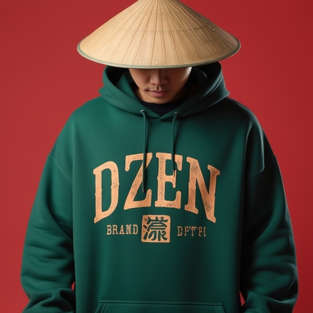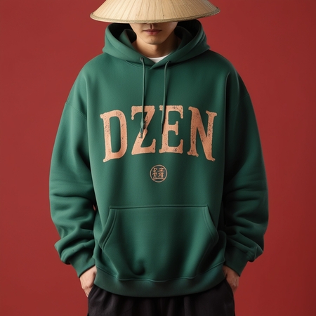 The image shows a person wearing an oversized green hoodie. The hoodie features a graphic design with brand «DZEN». The person is also wearing a traditional conical hat. The background is red, making the person and the hoodie the focal point of the image. Make a logo «DZEN» of antique letters, thin and have asian atmosphere.