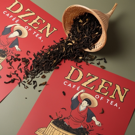 promt: The image features advertising poster for promotion of the «DZEN Café of Tea,». Posters are red, and scattered around it are dried tea leaves. The poster has a illustration that shows a person wearing traditional Asian clothing and a large hat and throwing the collected leaves down. Make a logo for the poster of brand «DZEN». The logo should be made of antique letters, thin and have asian atmosphere. The background is a muted green, complementing the earthy tones of the tea and posters.