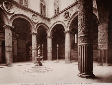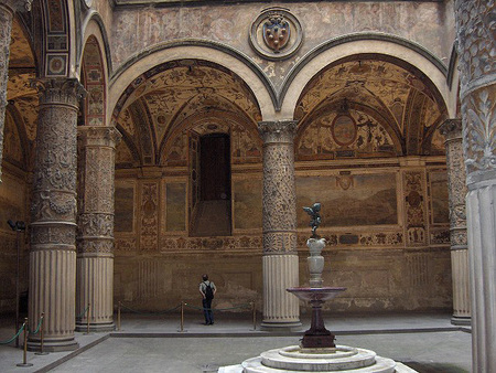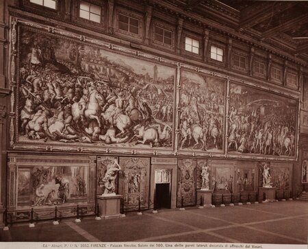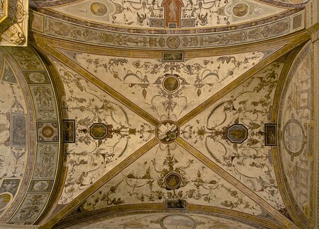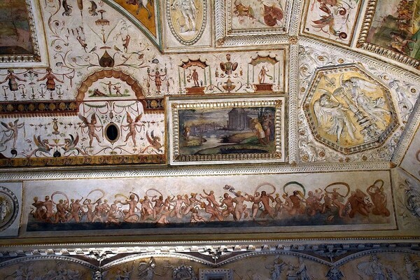 Палаццо Веккьо, Флоренция Потолочные и настенные росписи Зала Фивов содержат гротесковые орнаменты, включающие фантастические существа, маски, декоративные гирлянды и тонкие архитектурные фантазии. Они выполнены по образцу Рафаэля и демонстрируют ключевые приёмы Ренессанса: тонкую линейность, симметричность композиции и интеллектуальную игру с античными мотивами. Гротеск здесь — декоративный, утончённый, построенный не на пугающих образах, а на эстетической игре и стилизации.