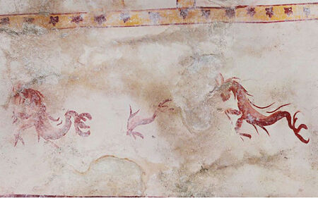 Вилла Мистерий, Помпеи Включает помимо известного фриза и небольшие орнаментальные зоны, расположенные между основными сценами. Эти промежуточные участки часто украшены миниатюрными фантастическими головами, масками, декоративными существами и фрагментами иллюзорных архитектур. Тонкая прорисовка, легкость линий и необычность форм подчёркивают влияние гротесковой традиции, связанной с использованием фрагментов фантазийного мира для заполнения промежуточного пространства и создания ощущения лёгкой нереальности.