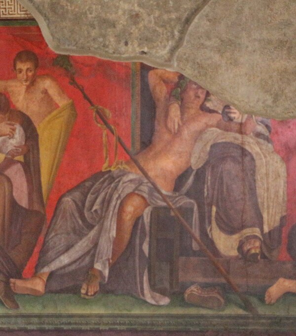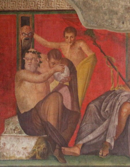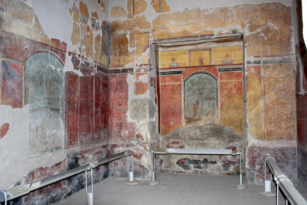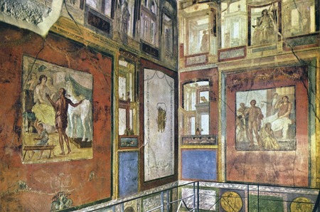 Дом Веттиев, Помпеи (I век н. э.) В интерьерах дома встречаются насыщенные декоративные панели, где рядом с изящными фигурами богов и нимф располагаются сфинксы, фантастические птицы и декоративные маски. Орнаментальные мотивы соединены с яркой цветовой палитрой, что усиливает впечатление живого, динамичного пространства. Эти росписи демонстрируют способность гротеска органично сосуществовать с мифологическим повествованием.