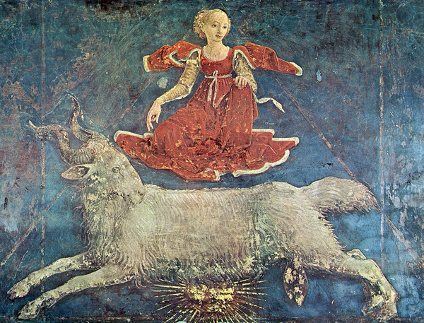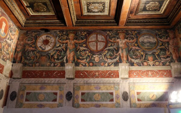 Палаццо Скифанойя, Феррара — Салон месяцев В верхних регистрах росписей присутствуют гротесковые декоративные зоны с гибридными животными, фантастическими драконами, масками, химерическими фигурами и орнаментальными гирляндами. Элементы соединяются в единый причудливый фриз, не подчинённый натуралистической логике. Это яркий пример раннего ренессансного гротеска, связанного с феррарской школой.