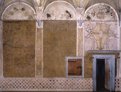 Камера дельи Спози, Андреа Мантенья Хотя Комната супругов известна прежде всего иллюзорной перспективой, её карнизы, пилястры и декоративные зоны имеют гротесковые мотивы: фантастические маски, декоративные профили, крошечные гибридные существа. Здесь гротеск проявляется в том, что декоративные элементы «выходят» из плоскости и как будто оживают, создавая эффект игры между реальностью и искусством — характерная черта ренессансного подхода к гротеску.