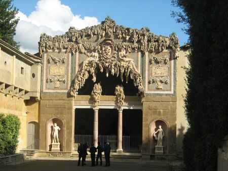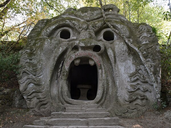 Грот Буонталенти, Сады Боболи, Флоренция Интерьер грота представляет собой феерию из сталактитовидных форм, каменных капель, маскаронов и гибридных созданий, будто выросших из стен. Эти полуживые, полуминеральные фигуры создают атмосферу фантастической «живой пещеры». Гротеск выражается в соединении органического и неорганического, реального и иллюзорного.