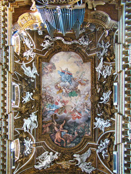 Санта-Мария-делла-Виттория, Рим В нишах и на стенах капеллы расположены маскароны, ангелы с необычно эмоциональными лицами и фантастические крылатые существа. Эти элементы усиливают театральность сцены «Экстаза Святой Терезы», превращая пространство в своеобразную «мистическую сцену». Гротеск проявляется в чрезмерной экспрессии и намеренной драматизации образов.