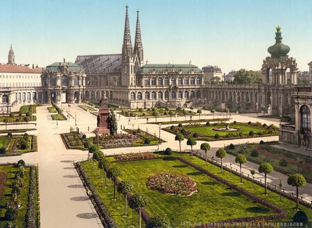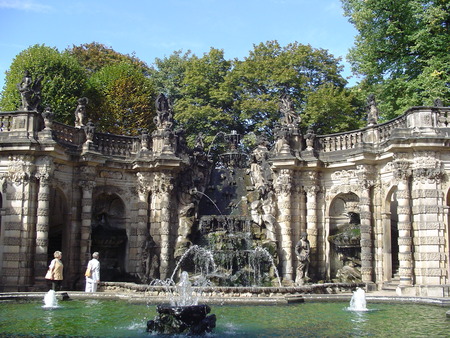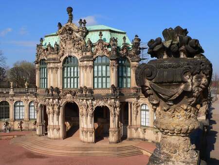 Цвингер, Дрезден На фасадах дворцового комплекса можно увидеть гротескные маскароны, химерические головы, животных-гибридов и фигуры, соединяющие человеческие и звериные черты. Немецкое барокко тяготеет к массивности и декоративному насыщению, что усиливает гротесковый эффект. Скульптурные элементы как будто давят на архитектуру, создавая ощущение динамики и напряжения.