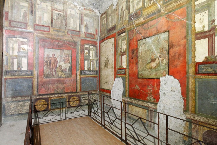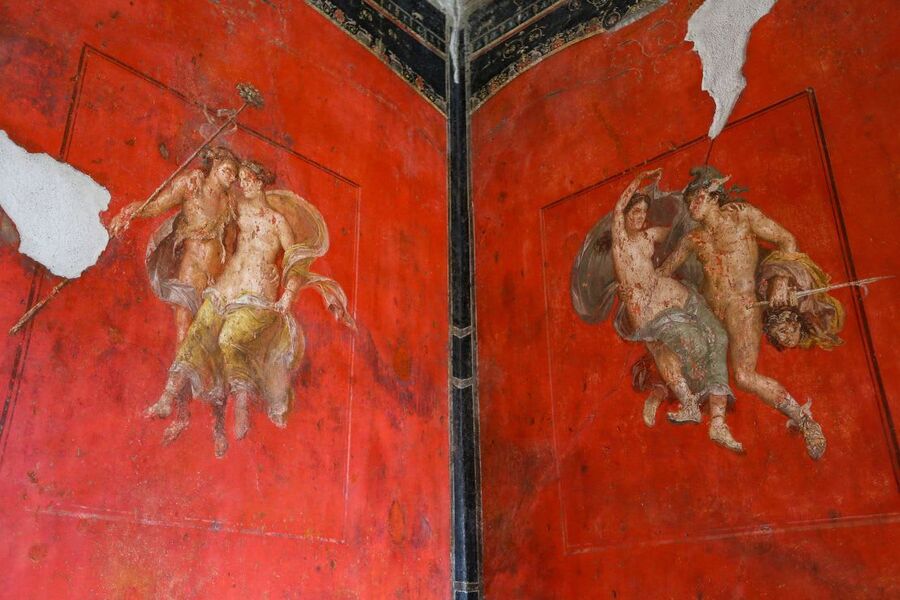 Одним из значимых объектов является триклиний (обеденный зал) женской половины дома Веттиев (середина I в. н. э.). В его росписях сохранились уникальные фризы с композициями, где мелкие фигурки амуров, птиц и мифологических персонажей причудливым образом переплетаются с элементами растительного орнамента. Эти росписи не подчиняются строгой иерархии, а создают ощущение свободного парения и танца орнаментальных элементов.