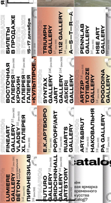 «|catalog| — профессиональная ярмарка современного искусства, основанная галеристами и поддерживаемая экспертным сообществом. Основная цель — развитие российского арт-рынка, повышение его прозрачности и создание атмосферы уверенности через формирование стабильного ярмарочного цикла» [1]