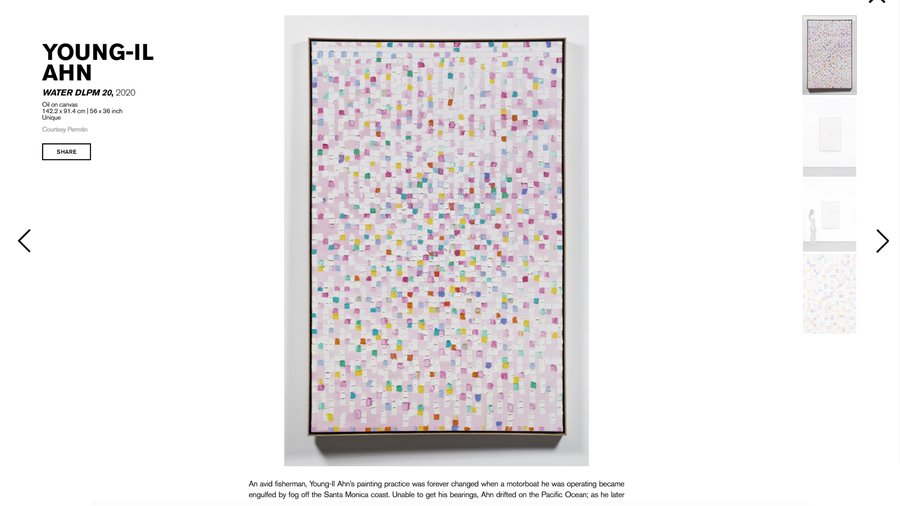 Perrotin в viewing rooms делает ставку на визуальную скорость. Изображения плотные, яркие, последовательность напоминает рекламную ленту. Большие фотографии сменяют друг друга с лёгкостью, а короткие подписи позволяют зрителю быстро ориентироваться. Это формат, ориентированный на динамичное потребление: галерея не замедляет внимание, а наоборот, усиливает поток визуальной информации. Такой подход демонстрирует коммерческую уверенность: искусство здесь — часть современного ритма.