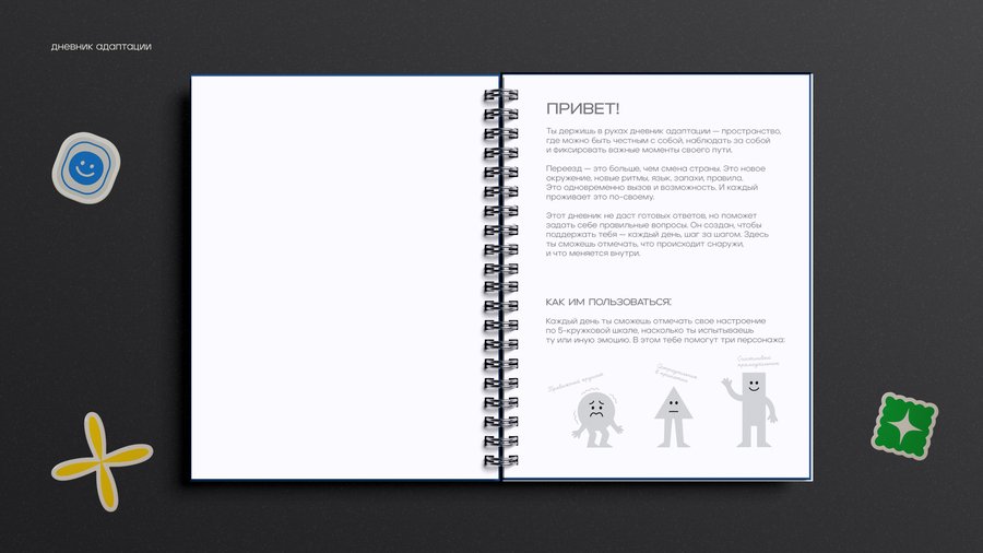 Дневник адаптации создан для того, чтобы помочь людям в период освоения на новом месте. Он рассчитан на 1 месяц: каждый день человек будет заполнять его, отвечая на вопросы о том, как прошел его день и что он чувствует.