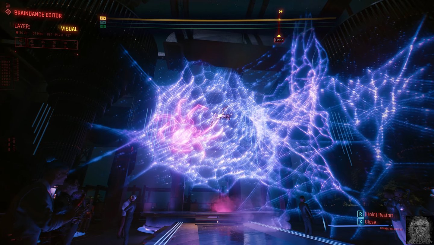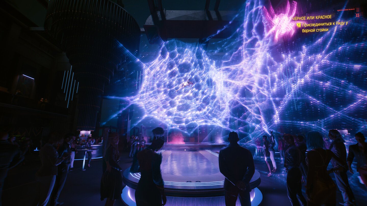 Над сценой разворачивается целое голографическое шоу: хромированная звезда Найт‑Сити появляется на сцене с огромными ангельскими крыльями за спиной, которых она вскоре лишается; образы угроз в виде гигантской головы злобно лающего пса и розового паука, подбирающегося к зависшей в воздухе — на светящейся подобно миллионам созвездий паутине — героине, все они возникают и рассыпаются один за другим.