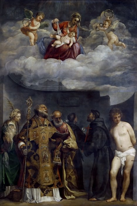 Тициан — Мадонна с Младенцем в славе со святыми Екатериной, Николаем, Петром, Себастьяном, Франциском и Антонием Падуанским 1520-25 и Тициан — Рождение Венеры (Афродита Анадиомена) 1520.