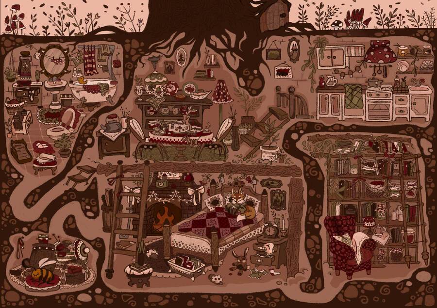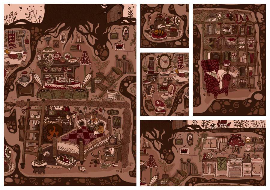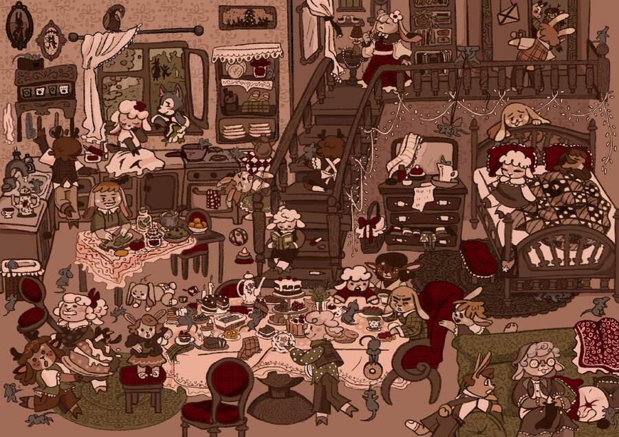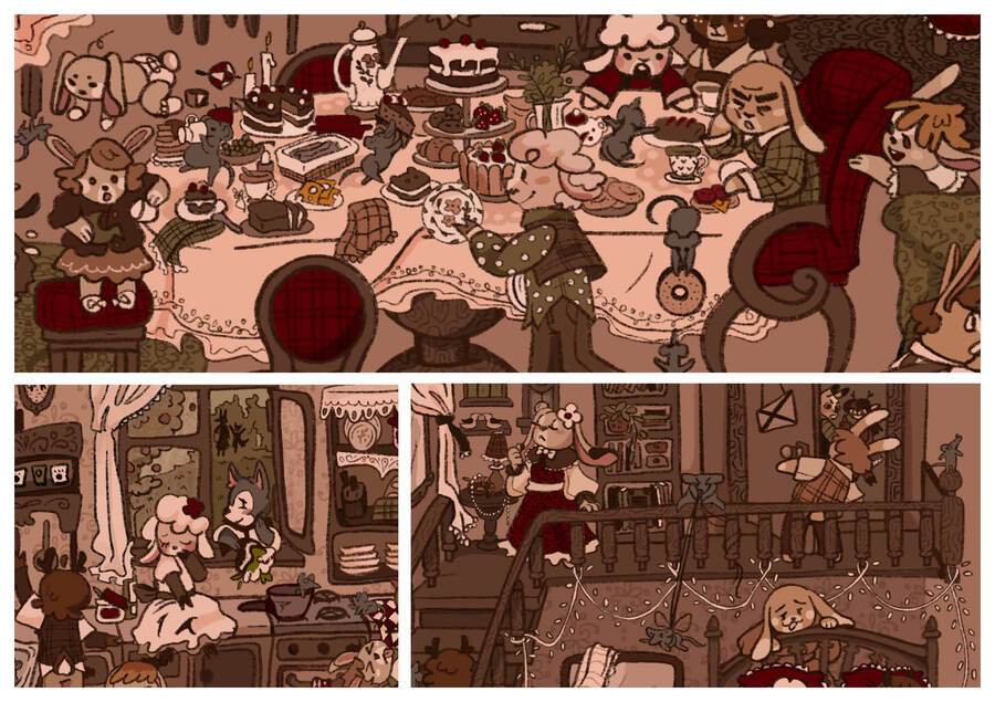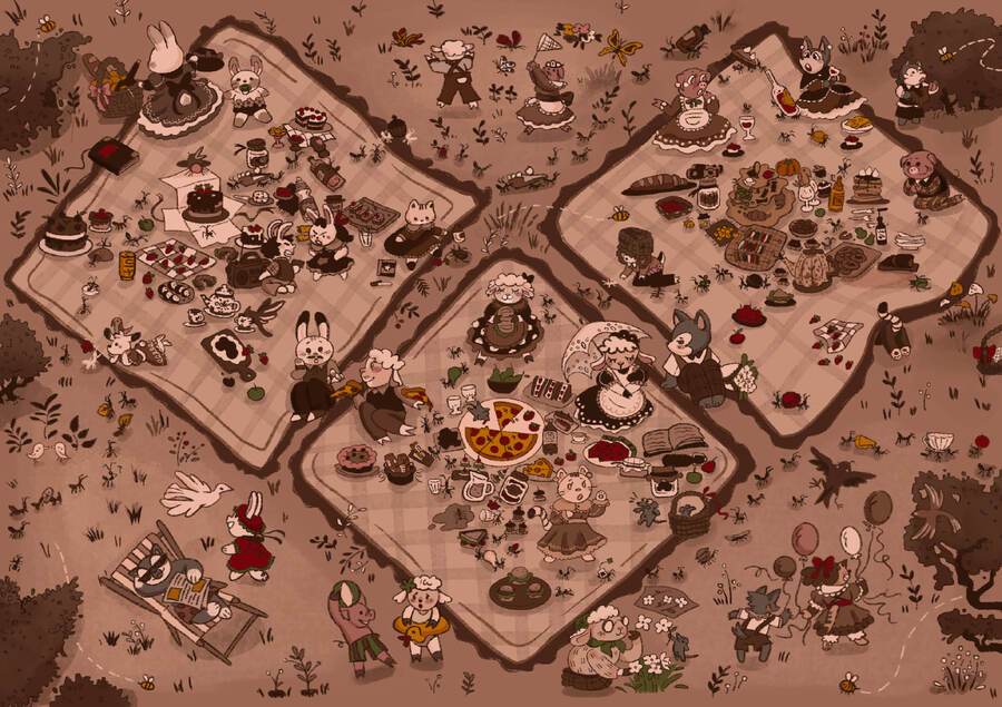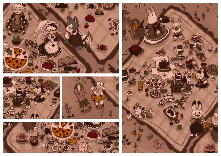 «Зверята» — виммельбух о бытовых ситуациях из жизни беззаботных зайчиков, барашков и других милых животных. Вместе они устраивают пикники, семейные застолья, ловят бабочек и дарят цветочки. Повседневность зверят наполнена уютом, спокойствием и всеобъемлющим дружелюбием.