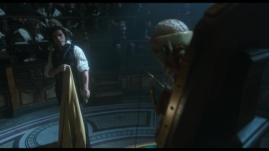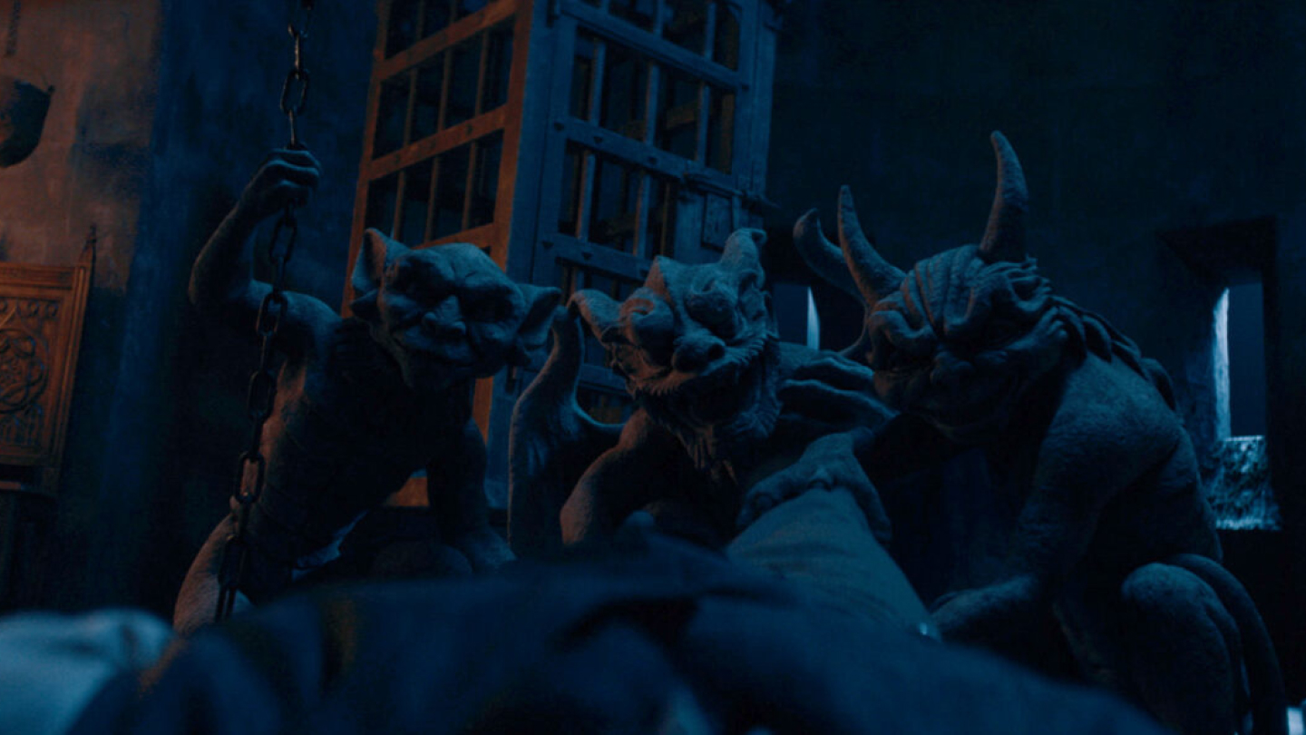 На первом изображении — финальная версия кадра после VFX. Актеры полностью удалены, а их позиции занимают CG-горгульи. Они ведут себя максимально «по-живому», взаимодействуют с камерой, держатся за цепь, нависают над персонажем. Дизайн и анимация этих существ были созданы в MPC Paris под руководством Лорана Креузо.