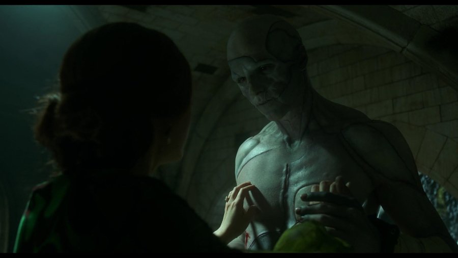 Поведение швов зависит от работы мышечной и тканевой симуляции, когда актер поворачивает голову или поднимает плечи, цифровая модель перераспределяет напряжение, и рубцы ведут себя как часть реальной биологической структуры. Такой подход невозможен в практическом гриме, где накладка остается жесткой. Здесь же монстр перестает быть гримом на человеке, он становится отдельной анатомической системой, визуально независимой от ограничений человеческого тела.
