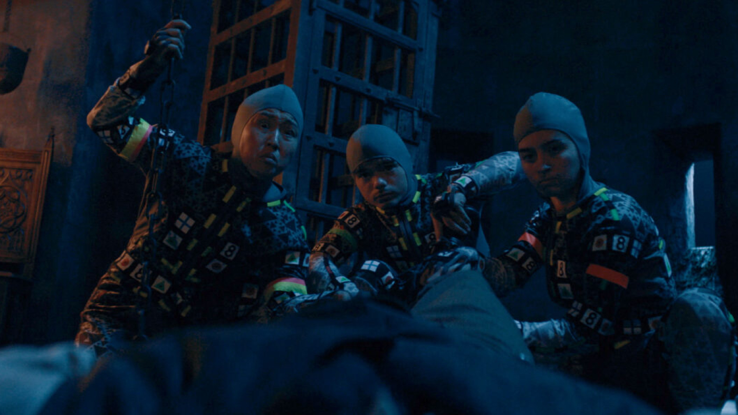 На втором изображении мы видим исходный съемочный материал. Три актера-каскадера в трекинговых костюмах. Они взаимодействуют с реальным реквизитом и актером — это опорная пластина для последующего VFX. Их движения, темп, дистанции и пластика тела фиксируются камерой и затем будут полностью заменены цифровыми горгульями.