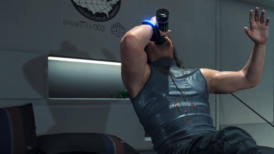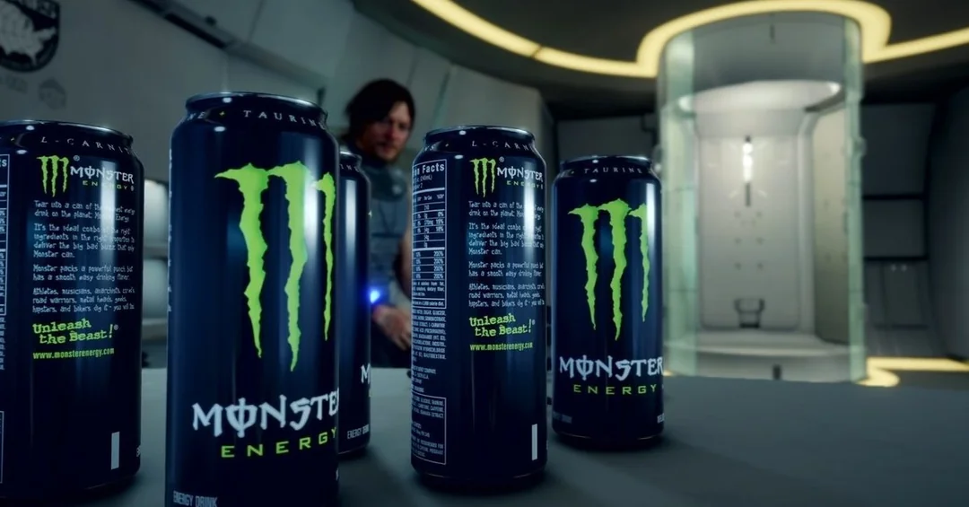В игре Death Stranding присутствует интеграция реального бренда Monster Energy, который становится заметной частью игрового мира и геймплея. Главный герой, Сэм Портер Бриджес, может употреблять напиток Monster Energy, что оказывает непосредственное влияние на игровой процесс: в некоторых версиях игры это временное усиление состояния или восстановление выносливости персонажа. Кроме того, в личных помещениях героя размещены многочисленные банки Monster, что подчёркивает важность бренда для окружения и делает его естественной частью игровой среды.