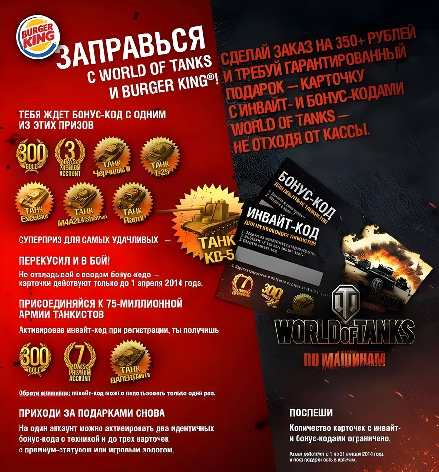 В разных странах сеть Burger King выпускала тематический «Танкобургер» — бургер с чёрной булочкой и визуальным оформлением, отсылающим к эстетике World of Tanks. Покупатель получал специальную карточку с уникальным промо-кодом, который активировал внутриигровые бонусы: приглашения для новых игроков, премиум-аккаунт, временные танки или внутриигровую валюту. Таким образом, реальный товар становился порталом обратно в цифровую среду игры. В разных регионах кампания имела свои особенности: в России и Беларуси она проходила ограниченный период, в Польше подобный Tank Burger входил в меню по фиксированной цене, а в Казахстане правила акции подробно регламентировали выдачу кодов за каждый купленный бургер. Несмотря на локальные отличия, общий принцип оставался единым: покупка физического продукта активирует цифровые награды.