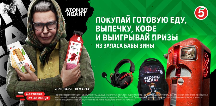 Коллаборация «Пятёрочка × Atomic Heart» включает в себя реально существующего внутриигрового персонажа и является ярким примером того, как бренды и игровые вселенные могут взаимодействовать в реальном мире. В начале 2025 года сеть магазинов «Пятёрочка» запустила акцию в честь выхода дополнения к игре Atomic Heart. Механика акции была построена на том, что покупатели, приобретая готовую еду, выпечку или кофе, могли регистрировать чеки через Telegram-бот и участвовать в розыгрыше различных призов, включая мерч, сертификаты на технику и главный приз — кастомный игровой ПК, стилизованный под ремонтный шкаф «Элеонору» из игры.