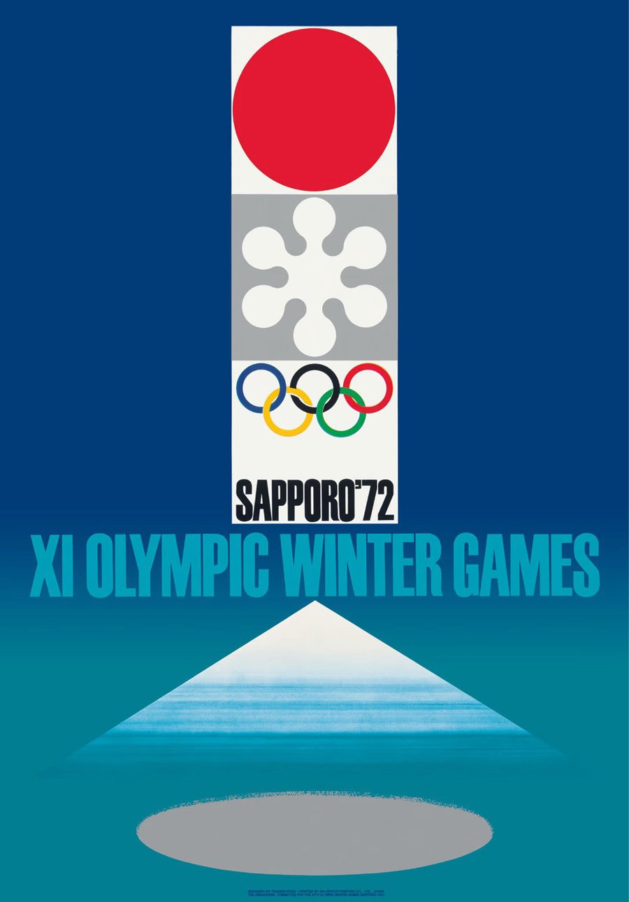 Автор работает с наследием летней Олимпиады 1964 года, но создает более сложный по структуре логотип, состоящий из трех элементов. В верхней части Казумаса Нагаи намеренно использует красный круг — символ восходящего солнца, отсылающий к Японии. В средней части логотипа дизайнер вводит снежинку, созданную на основе традиционной японской семейной эмблемы камон. Еще одним элементом являются олимпийские кольца и название Олимпиады «Sapporo ’72». Такой гибкий логотип, построенный как будто по модульной сетке, становится по-настоящему революционным.