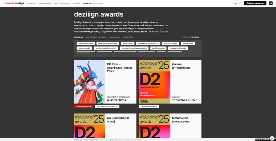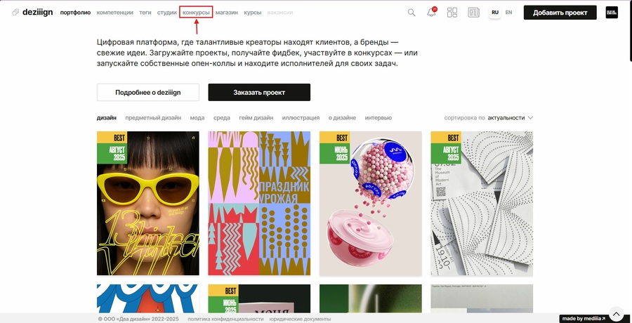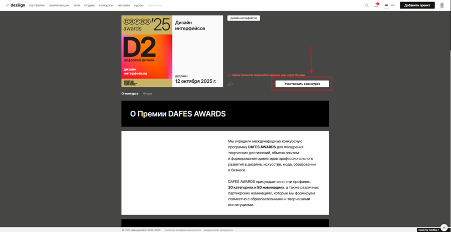 Чтобы подать проект на конкурс, откройте страницу конкурсов, выберите интересующий Вас конкурс, нажмите кнопку «Участвовать в конкурсе» и отправьте проект из Вашего портфолио.
