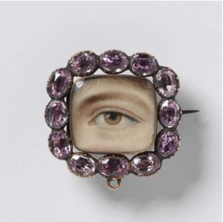 Eye Miniature with Tears Set in a Brooch with Pearl Frame c. 1800. © Victoria and Albert Museum, London / Cushion Shaped Eye Miniature Set in a Brooch with Pink Stone Frame c. 1800. © Victoria and Alber