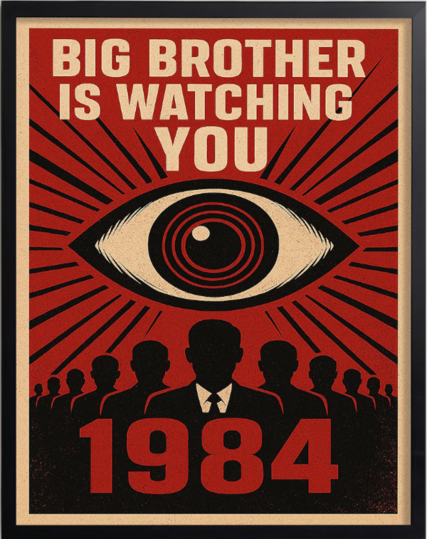 «Big Brother Is Watching You» — один из самых устойчивых визуальных символов и узнаваемого лозунга тотального надзора и политического контроля. Глаз отсылает к постоянному наблюдению со стороны власти.
