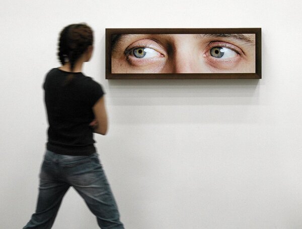 Инсталляция Рафаэля Лозано-Хеммера «Бинокулярное напряжение» — это световой короб, который показывает два человеческих глаза, отслеживающие зрителя с помощью встроенной системы наблюдения.