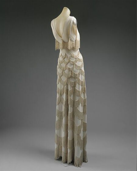 Конечно же, помимо повседневных и спортивных образов флэпперов существовали тренды на вечерние платья. Одним из ключевых дизайнеров десятилетия стоит выделить Жанну Ланвен. Она была известна своими вечерними платьями, которые раскрывались благодаря обильному декору. Использовались различные сияющие материалы: пайетки, жемчуг, бисер, бархат и многие другие. Появление и распространение декора совпадает с бурным развитием индустриализации, в ходе которой производство таких деталей перестало быть неоправданно дорогим [2].